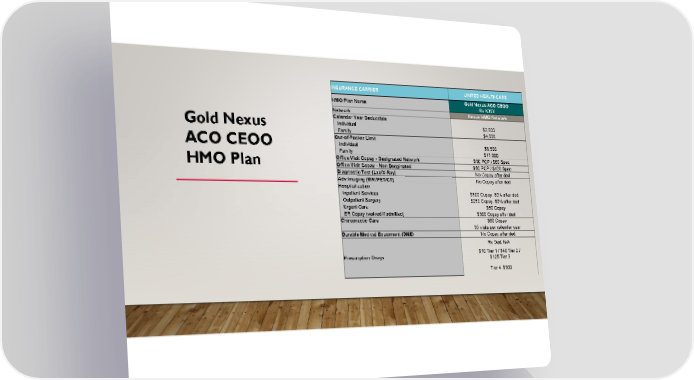 INSURANCE CARRIER UNITED HEALTHCARE Gold Nexus ACO CEOO HMO Plan Name Rx K35Y Network Nexus HMO Network Calendar Year Deductible Individual $2,000 Gold Nexus Family $4,000 Out-of-Pocket Limit Individual $8,500 ACO CEOO Family $17,000 Office Visit Copay - Designated Network $30 PCP / $60 Spec HMO Plan Office Visit Copay - Non Desginated $60 PCP / $120 Spec Diagnostic Test (Lab/X-Ray) No Copay after ded Adv Imaging (MRI/PET/CT) No Copay after ded Hospitalization Inpatient Services $500 Copay, 80% after ded Outpatient Surgery $250 Copay, 80% after ded Urgent Care $50 Copay ER Copay (waived if admitted) $300 Copay after ded Chiropractic Care $60 Copay 35 visits per calendar year Durable Medical Equipment (DME) No Copay after ded Rx Ded: N/A $10 Tier 1 / $40 Tier 2 / Prescription Drugs $125 Tier 3 Tier 4: $300